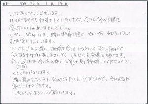 また、先生は毎回今の私の体の状態を見て施術してくださるのでとても助かります。